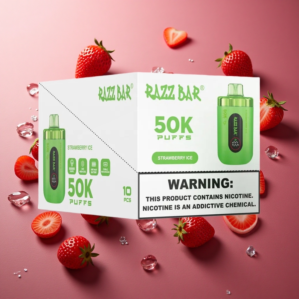 Razz Bar 50K Puffs Eldobható E-cigaretta Eper Jég 1.0 Ohm Mesh Coil és 650 Mah Akku